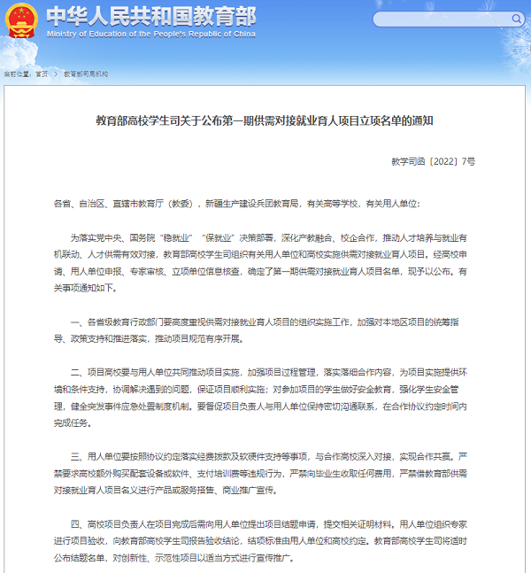 为落实党中央、国务院“稳就业”“保就业”决策部署,深化产教融合、校企合作,推动人才培养与就业有机联动、人才供需有效对接,近日,教育部高校学生司印发《关于公布第一期供需对接就业育人项目立项名单的通知》(教学司函〔2022〕7号)。