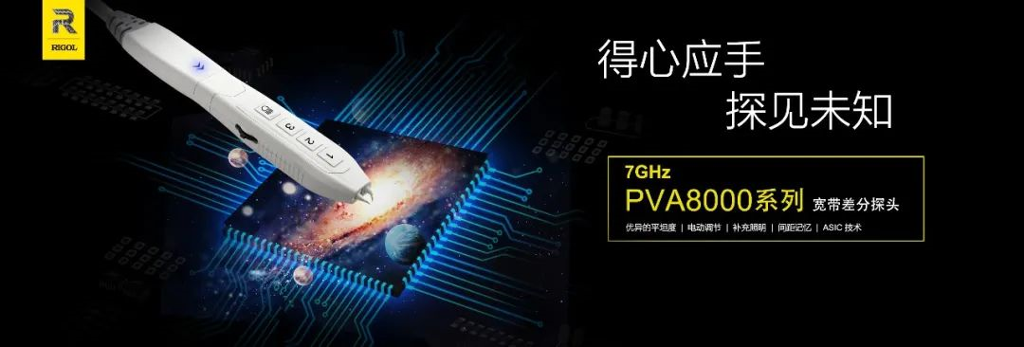 同时发布基于RIGOL自主研发宽带探头芯片的有源差分探头PVA8000系列,宽带高达7GHz,业内首创的电控探针间距调节,具有间距记忆功能的人性化设计,可提高探针尖间距操控的精确性。具备手持差分、手持单端、焊接差分、焊接单端等全套探头尖组合,可与DS70000系列产品完美匹配。